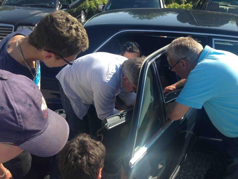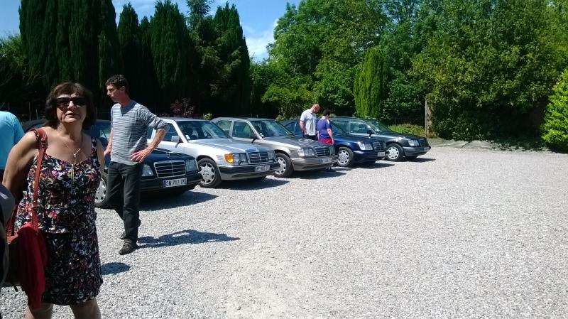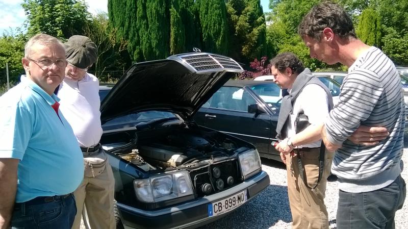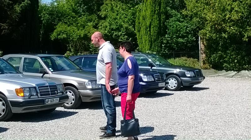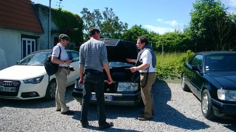 - Cyril est venu avec Maud en w126 560sel en covoiturant nos amis Amercio (as94) et Yves (yves500). Ce dernier avait pris d'assaut la place de choix, à l'arrière droite sur cette rare "banquette" à deux sièges séparés... Et bien Yves a voulu descendre la vitre qui en a profiter pour s'échapper en fond de portière...