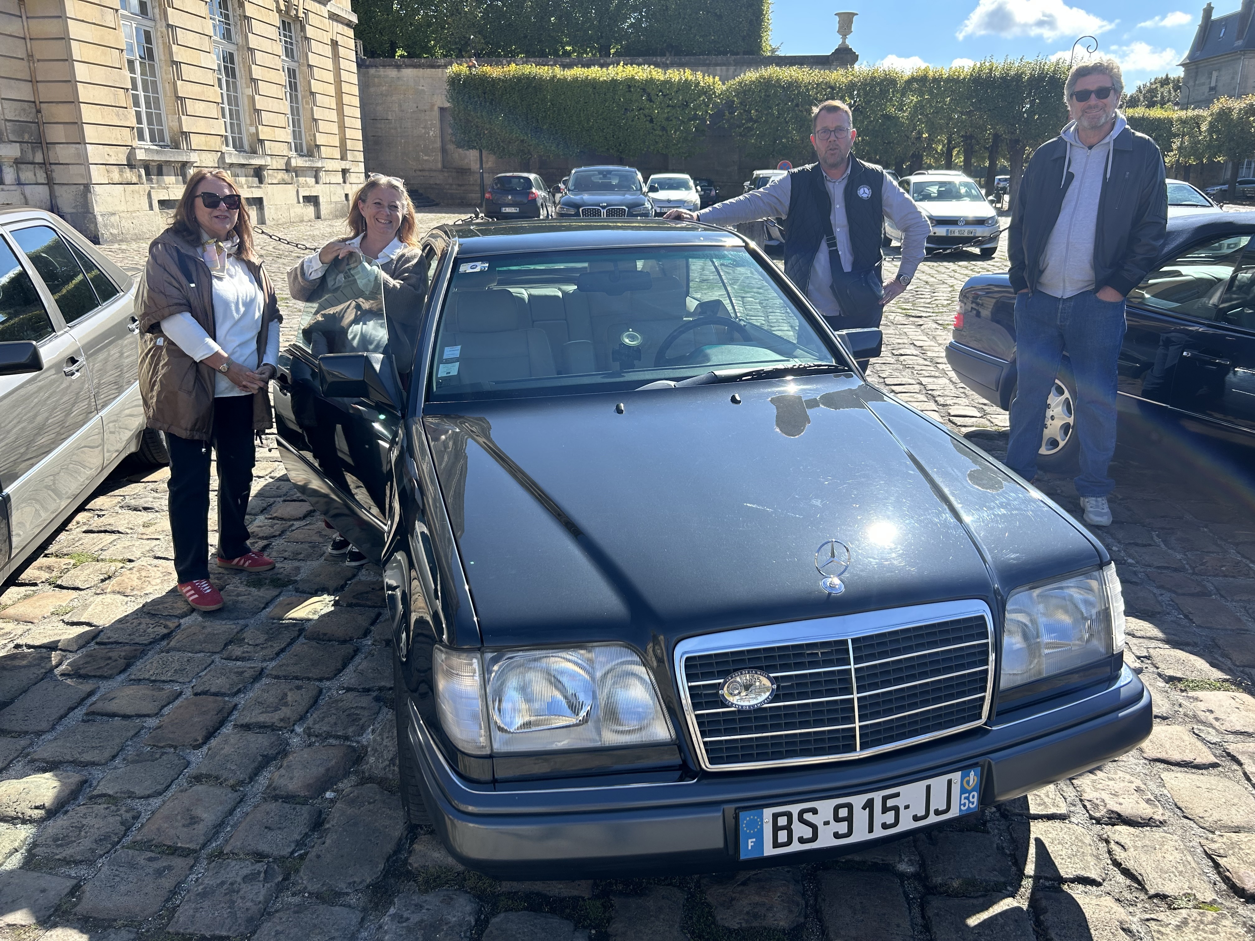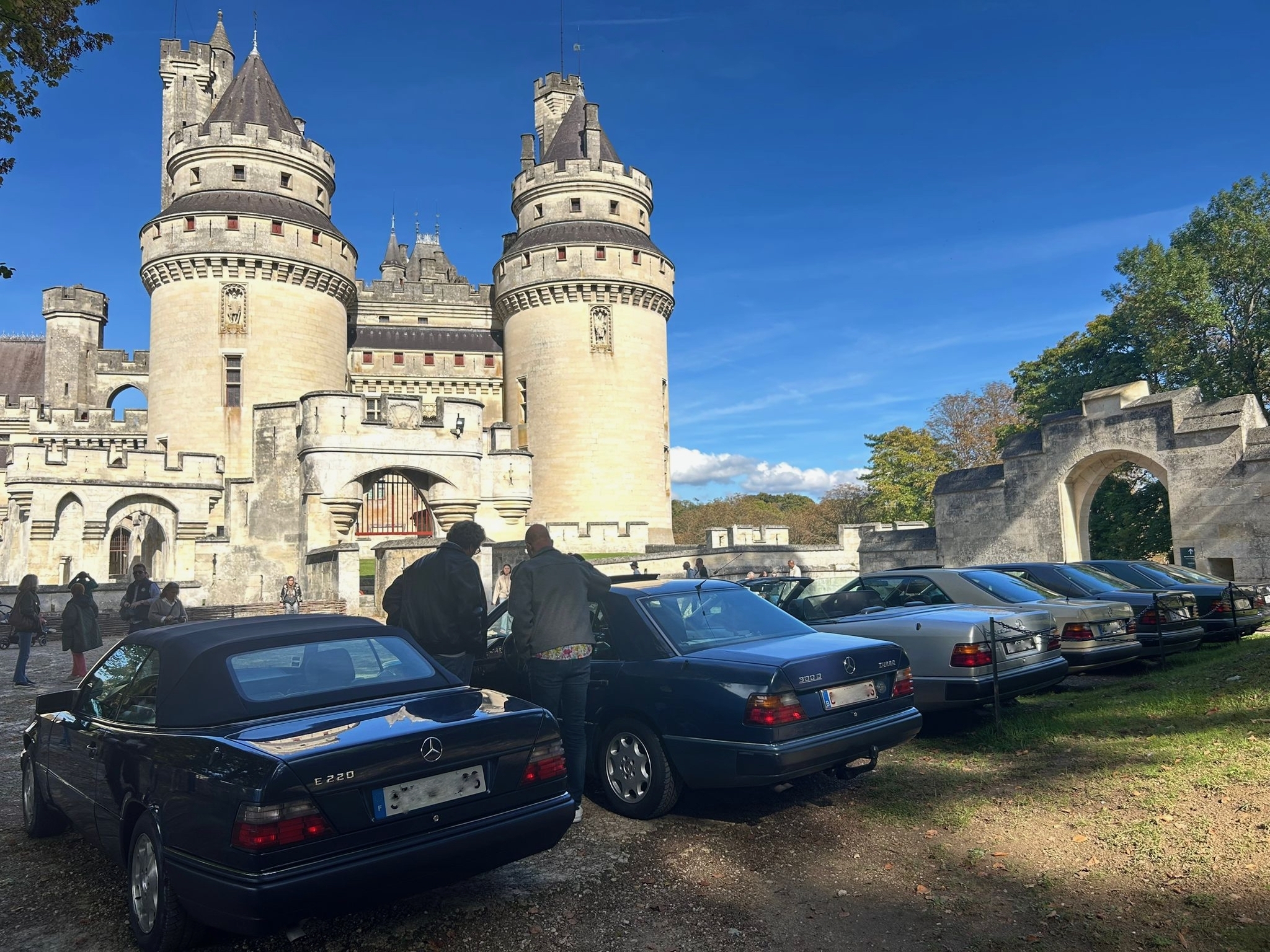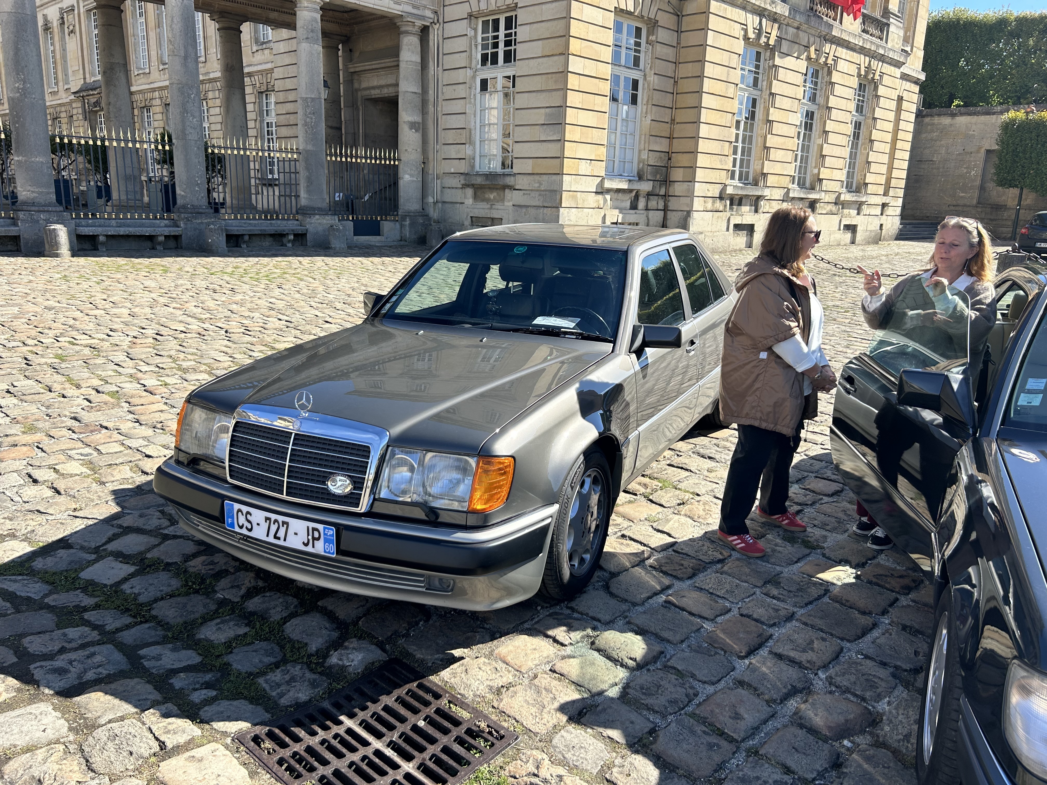 Patricia l'épouse de Jean Marc en compagnie d'Emmanuelle et la 500E somptueuse d'Hervé, vaisseau amiral de la gamme W124 , toujours devant l'écrin du Chateau de Compiègne ....