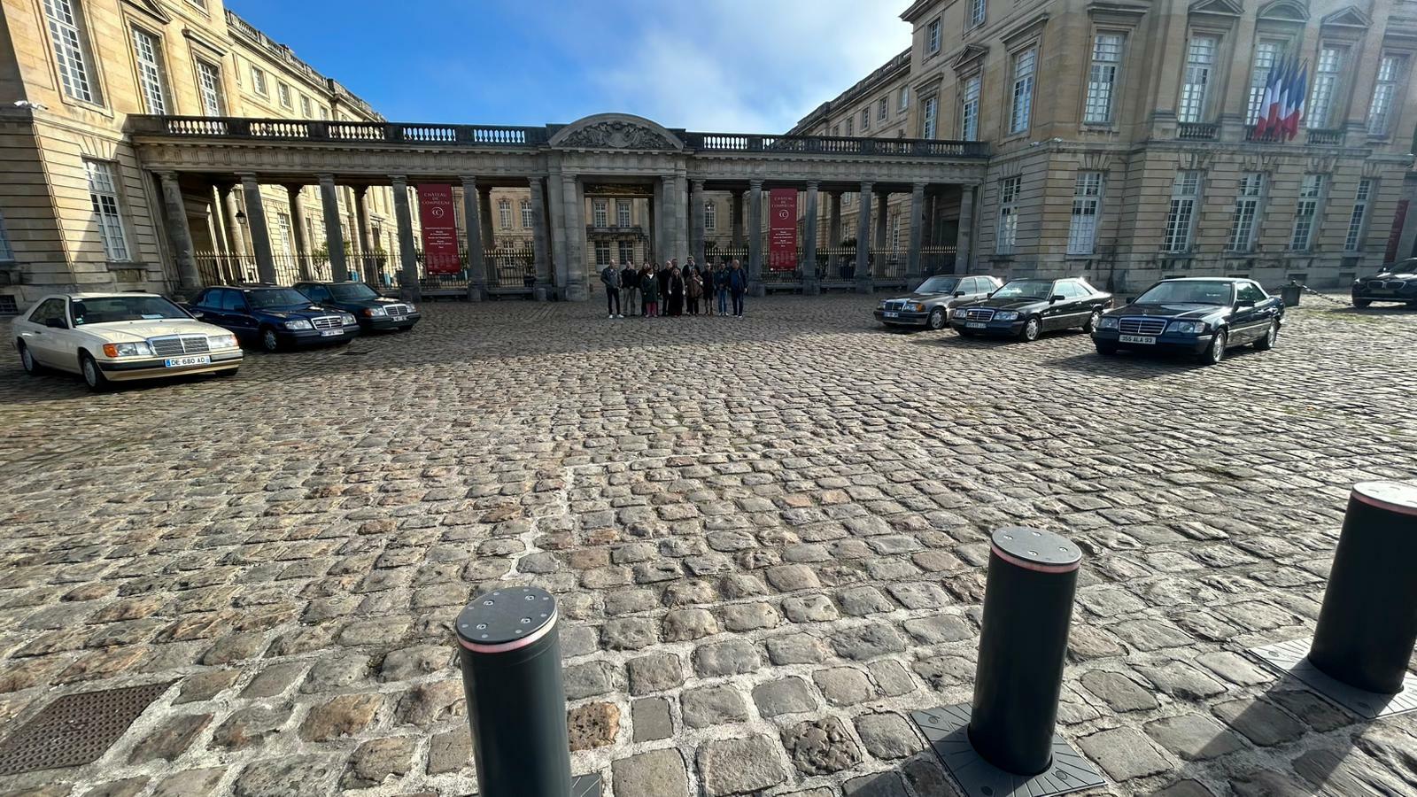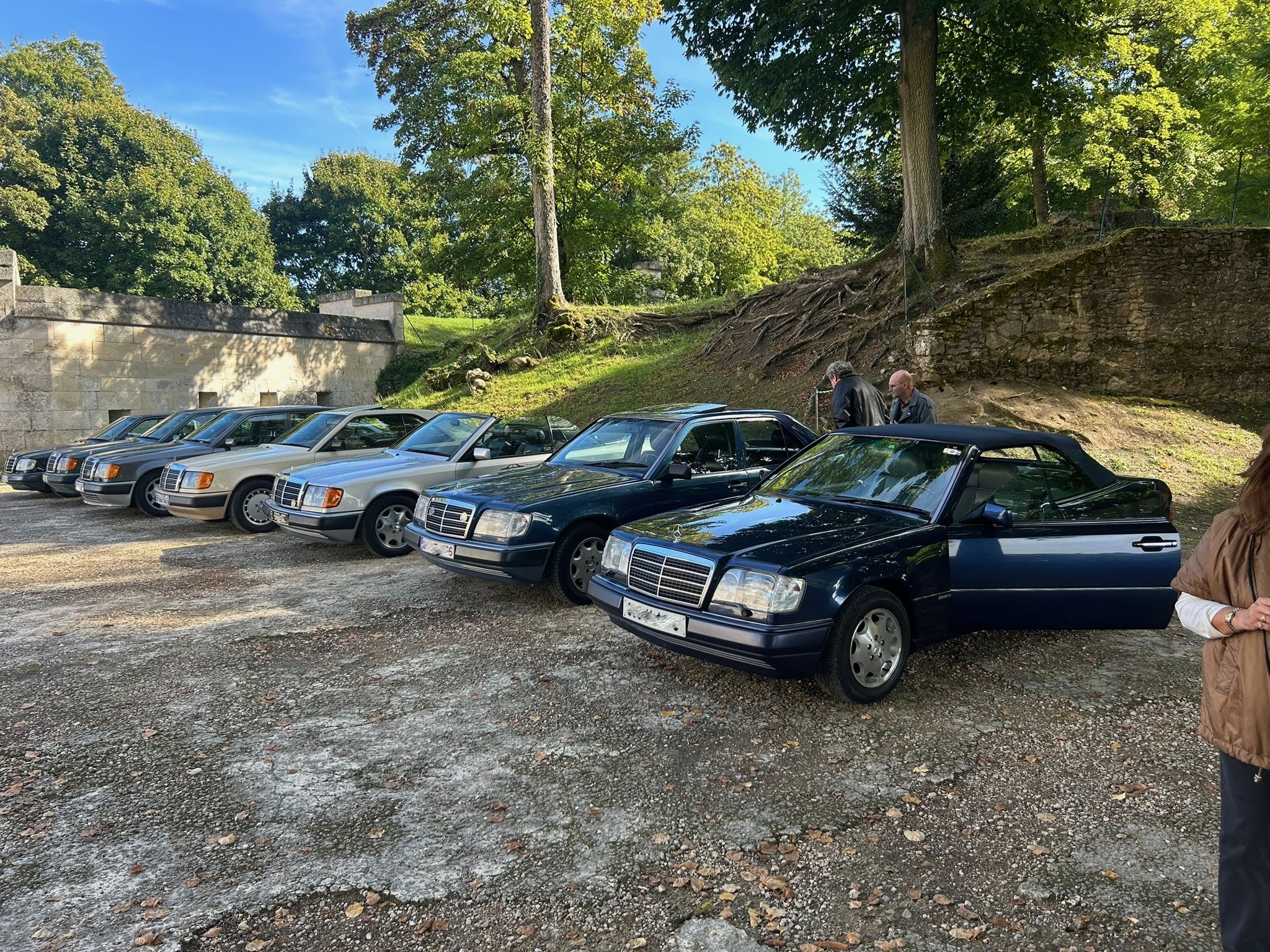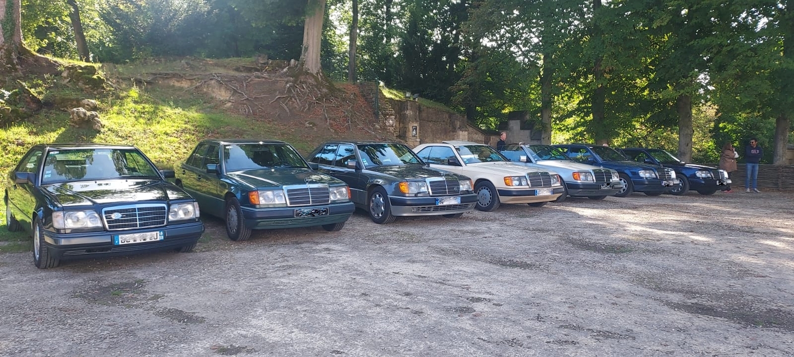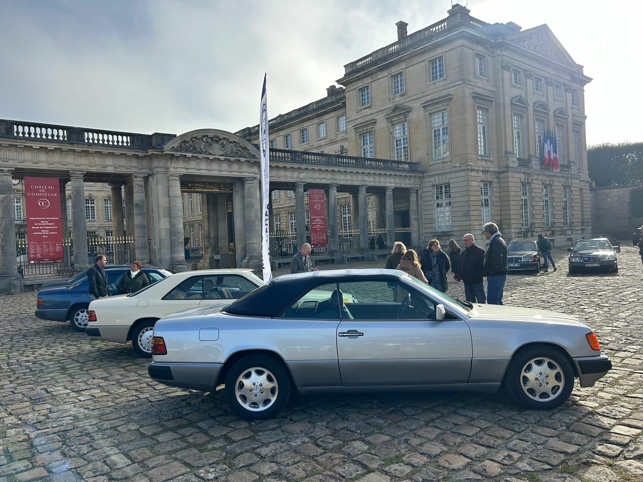 Patricia l'épouse de Jean Marc en compagnie d'Emmanuelle et la 500E somptueuse d'Hervé, vaisseau amiral de la gamme W124 , toujours devant l'écrin du Chateau de Compiègne ....